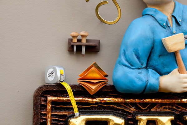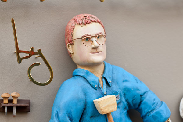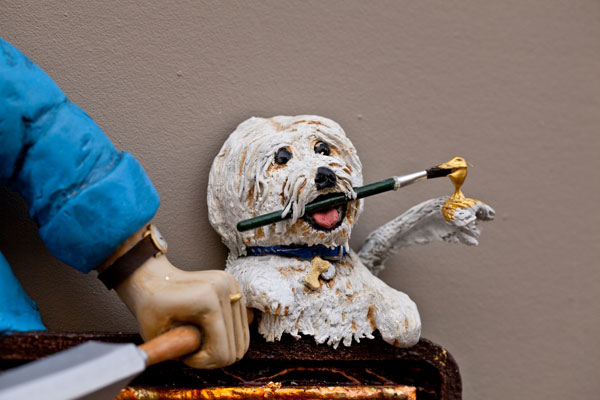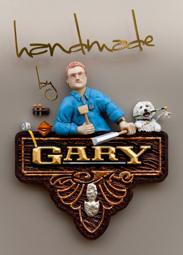 Posted by Gary Johnson on 10 December 2012 at 04:31This is a self promotional sign I created for our showroom. The sign is a combination of many techniques which are meant to showcase a number of our strengths which include hand cut and polished brass lettering, cnc carved polyurethane, hand painted faux wood grain with both 23K and variegated gold leaf over prismatic lettering and graphics that have been enhanced with a gorilla glue technique. The figure is a self portrait with our shop dog DiDi hand painted and sculpted out of epoxy resin.