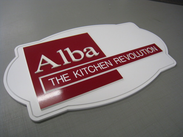 Here is a sign I just finished making for a Kitchen design company. It’s for their showroom. Made from 5mm and 10mm Foamalux which has been routered and glued together to produce a 3d engraved plaque. Finished using cut vinyl to provide the deep red colour