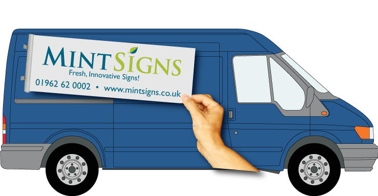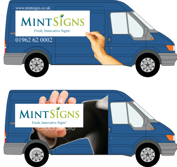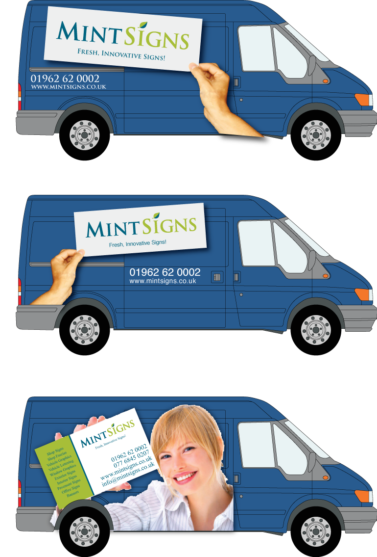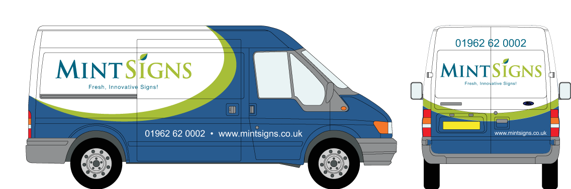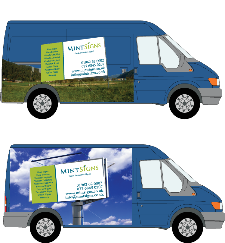 I like #2. I think you could make the "card" out of 4mm dibond and stand it off the van with spacers. Also I’d like to see lettering cut out of 1/2" PVC and bonded onto the Dibond backer. The mint leaf could be carved to a 3D shape. If the van is on the highway a lot, you’d have to anchor it down very well. 🙂 or make it removable with a vinyl image behind it on the van for highway speeds.