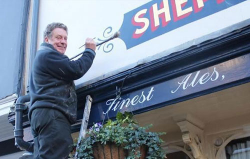 Artist Eric Pollard paints the signs of Shepherd Neame pubs