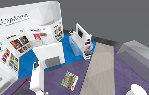 Separated by mere inches of brightly coloured exhibition carpet is the HP stand (D30). The main stand focus being the huge display of Latex printers available but there will also be the standard Z6800 inkjet and the Scitex FB5 UV on show. Timed demonstrations on the latex machines, live-streamed to the on-stand plasma display, will take place throughout the exhibition.