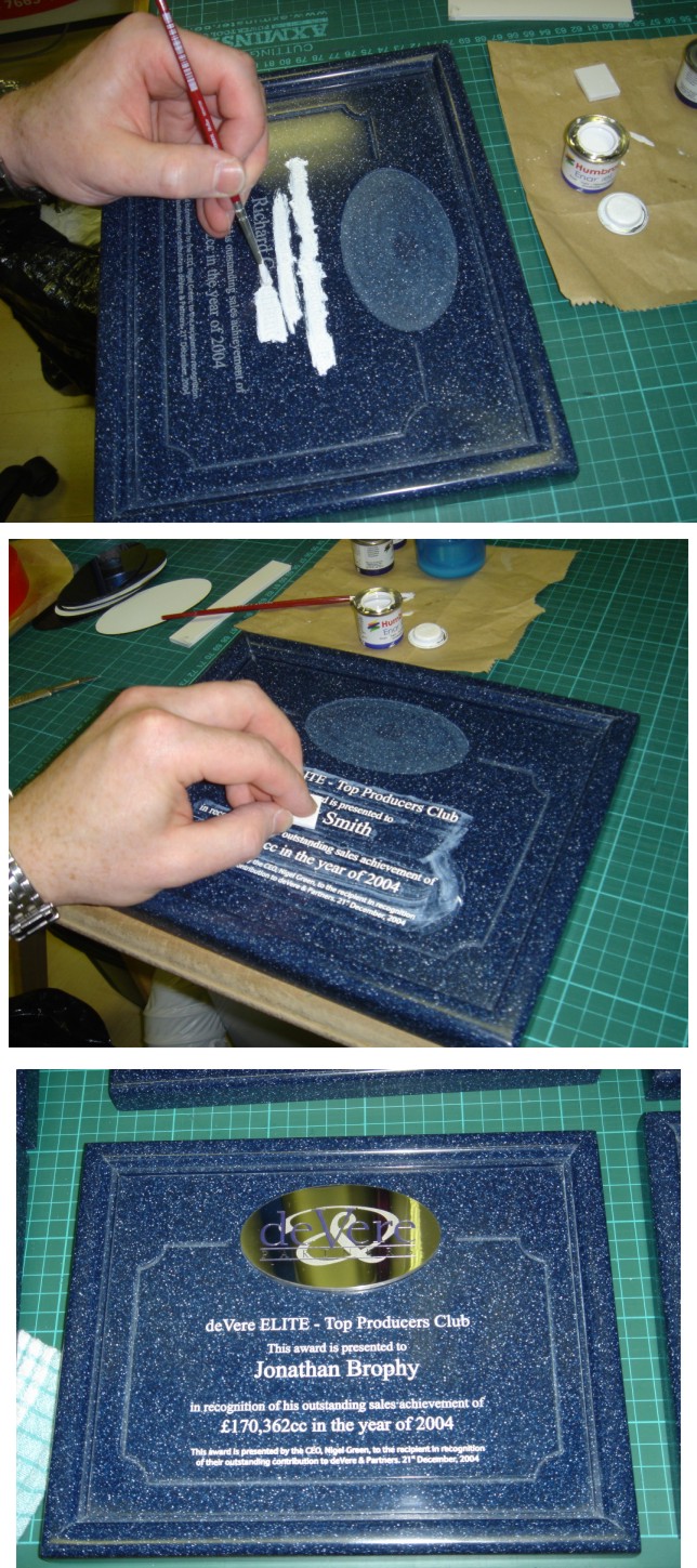 Dave, the blanks (colour chosen by customer) are Corian and I had them machined out by a specialist manufacturer. I laser engraved the text into them myself and paint filled for contrast. The Oval logo is 3mm polished stainless with the logo etched and filled.