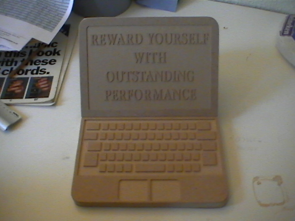 The client wanted a 250mm wide MDF laptop to adorn a make believe award he giving to a talented employee and thanks to me, one of my trusty Mac G4’s, Flexisign, Illustrator , artpath and my Gerber Dimentions 200 he got it…