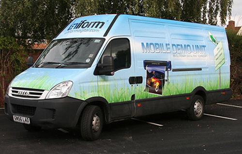 The mobile unit enables users to test the printers with their own artwork and to view all possible applications from the Uniform media swatch book. An experienced training specialist will demonstrate the capabilities of both the printer and cutter, and also be able to discuss individual requirements from potential purchasers.