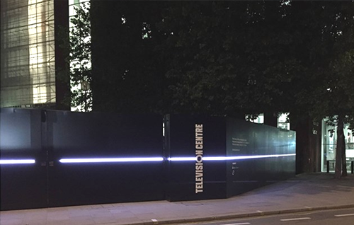 Over 100 metres of black satin dibond hoarding was installed, inset with an acrylic diffuser with a LED lighting strip. A simple yet extremely effective night feature. Stand off text in 10mm foamex was used on other parts of the hoarding.