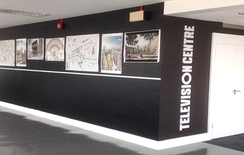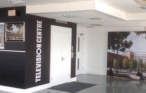 The redevelopment of the old BBC Television Centre by DN&Co for Stanhope plc is currently taking place at Wood Lane and, for Phase 1, Service Graphics produced and installed a giant banner, a hoarding and interior branding graphics.