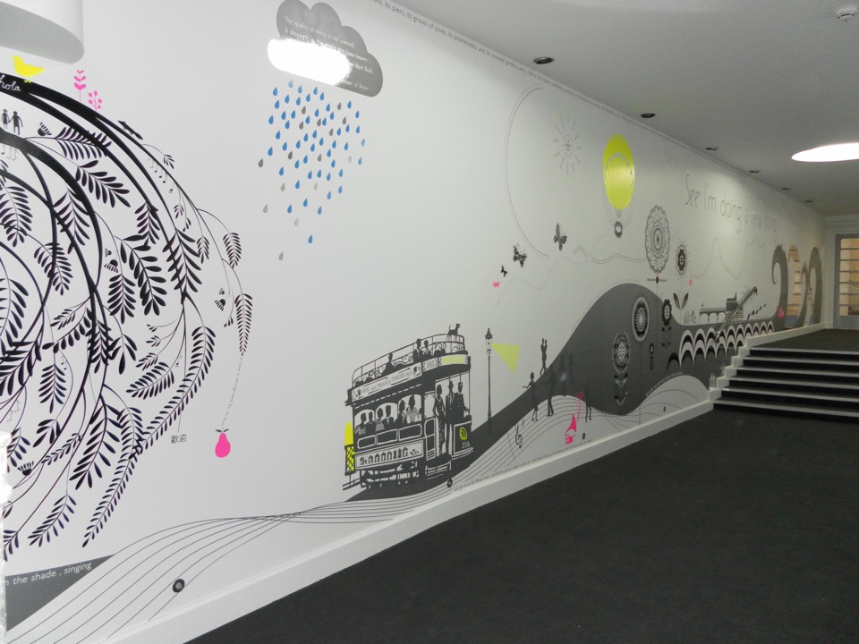 I was given 6 days to complete and that included cutting/weeding/taping 😮 😕 I use Conform Low Tack (and thanks to Gill at William Smith for the support and samples etc to test tapes) The wall was new and painted a few weeks prior and was done extremely well, not one bit of paint came off with app tape or masking tape, I even had to remove some of the large silver panels due to colour inconsistency which the supplier said was because I cut some width ways and other pieces long ways but even after re-cutting it had the same problem, but this came off the wall cleanly even though was stuck down well.