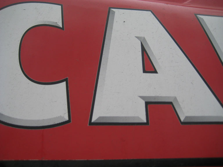 I am trying to re-create this beveled effect on some text. I will be printing it on a VersaCamm. I’m not that bothered about the halftone effect, but I am having trouble getting a nice sharp edged beveled effect in Ps, and Illustrator intersects the tight corners. Anyone know a better way of doing this? And, just out of interest, does anyone know what type of printer these were printed on, given the fact that they are unlaminated and the halftone effect?