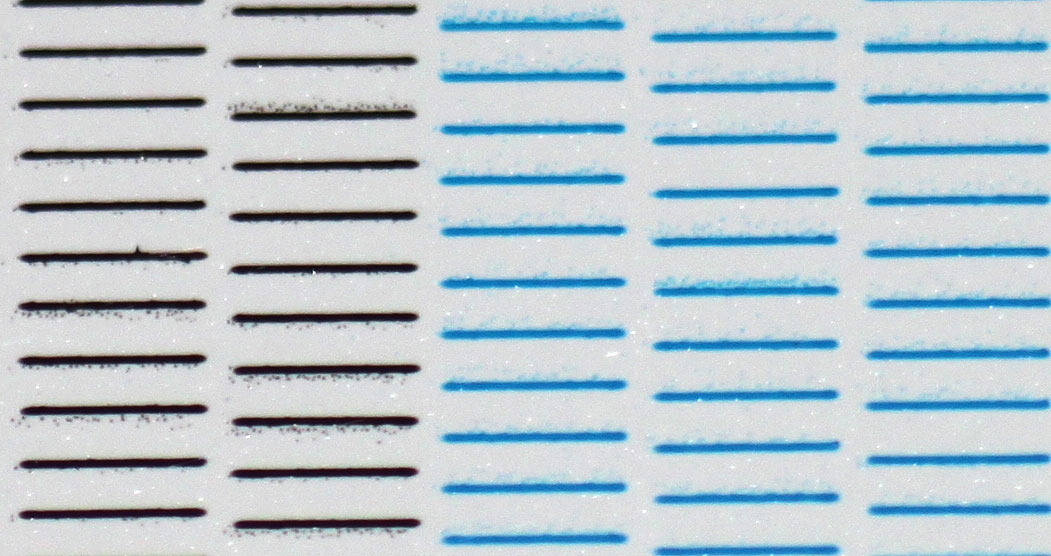 Roland SP300VLast few days I’ve been getting what looks like overspray on black and cyan – I’ve been cleaning everything, head soaks, more cleaning… and the nozzle check looked ok – but when checked under lupe the cyan seems to be ‘overspraying / deflecting’ one way and the black the other way.