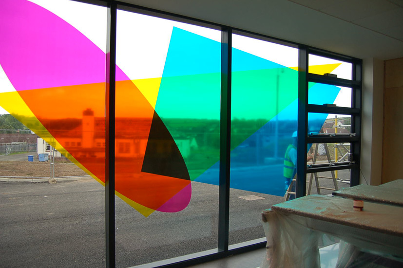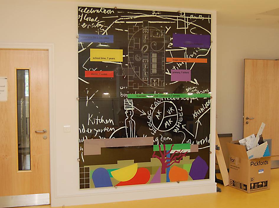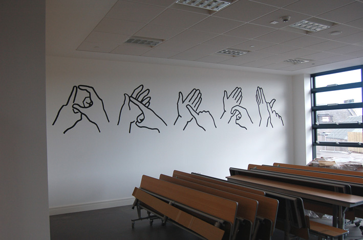 I would not start work in the school until after my days work…He was working in his room [late as well] with a thin line [painted and vinyl] and a huge compass type thing…..Enjoyed talking to him…very interesting although I think it’s all going to be a bit lost when all the kids go in on Monday…His installations look great in white rooms….