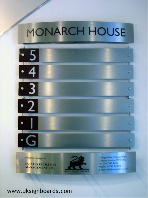 Monarch House: Custom made stainless steel Directory System.