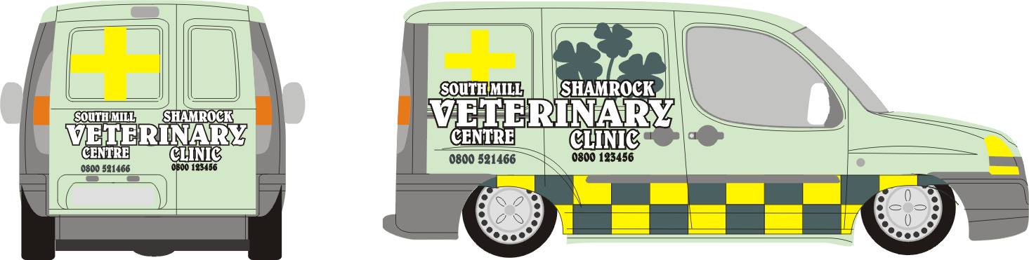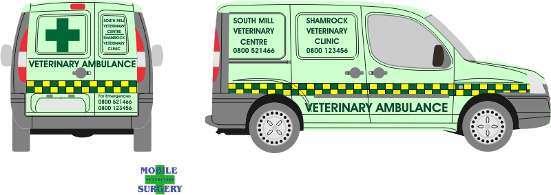 It’s for a Vet Ambulance, but the client want’s to incorporate both surgeries on one vehicle (hasn’t got correct number for new surgery yet)I have hit a stone wall with ideas.