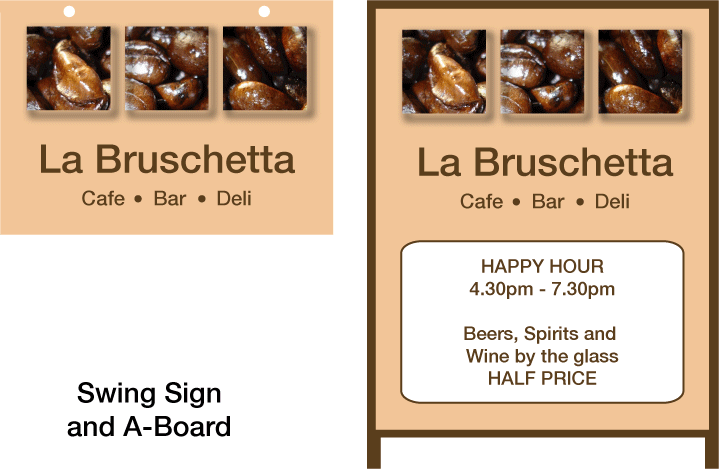 A-Board and hanging sign, digitally printed with vinyl lettering in the white panel to allow for ongoing amendments and offers.