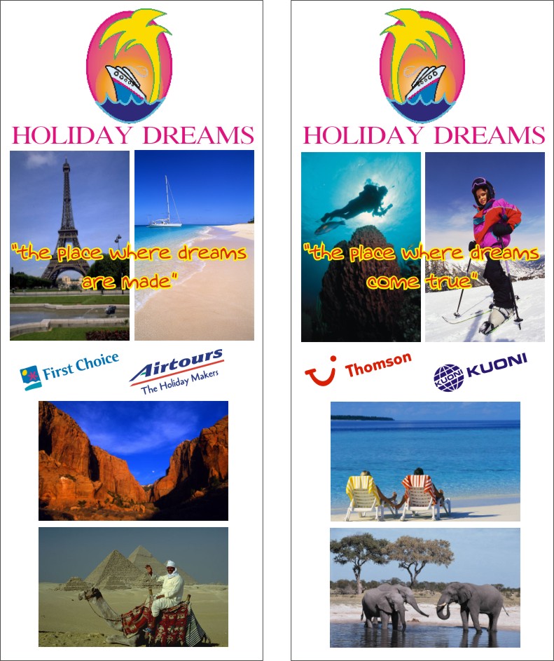 nice one carrie i like that, its not too crushed 😀 but i would have made the holiday dreams a bit bigger? 😀 and the logo smaller or better still move the photos up a bit to give the bottom more room 😛