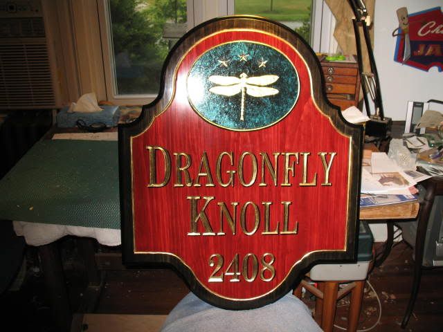 carved, Gold and Al leafed sign: dragonfly knoll