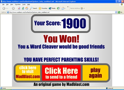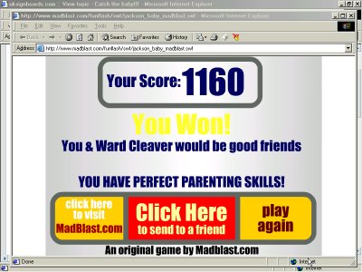 Catch the baby!!!Posted by ttj designs on 4 August 2004 at 12:57Driven nuts by the haggis bashin!! 898 the best to date!! But have a go at this one…. http://www.madblast.com/funflash/swf/ja … dblast.swf My best so far is 1110 !! Give it a go :point: (:) Mark Tunnicliffe replied 21 years, 3 months ago 8 Members · 9 Replies