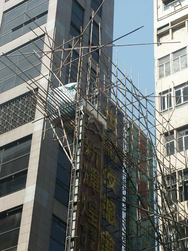 its structurally sound, they have the right amount of cross bracing, and providing they used a good sized screw, I cant see a problem with it…as Dave H pointed out, they use wooden scaffold in other countries, even as close as Spain, and to go up many storeys, it may not look the part, but it is obviously doing the job.