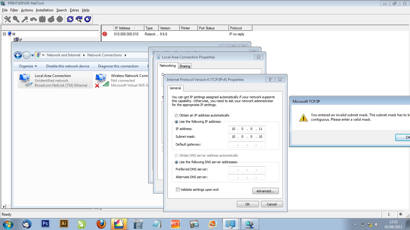 This is my first post. I’ve just purchased a sp-540v however am having issues connecting it to my laptop. When the chap brought it he installed it fine with VersaWorks with a crossover Ethernet cable. However when I’ve unplugged it and plugged my normal networked cable in connected to router it’s reset ip and now I can’t get it to connect to rip anything. I’ve attached Photo, it shows up in NET TOOL but can’t get the bloody thing to connect to network to communicate. I’ve tried setting ip to 10.0.0.10 and nothing, then tried to increase last digits to .11 and still no look. Tried setting mask to 10.0.0.11 and it won’t let me, says it must be contiguous.