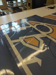 Now, along you come and you lay it out on the table to trim it up, but the tight wound vinyl has still got the memory of that round core and as it rolls out flat. The paper isn’t affected but the vinyl is and wants to keep it’s rolled shape. so it starts to lift and create the tunnels across the width of the roll as the paper liner and vinyl start to separate. which in this case is easy because the perforated vinyl has only 50% adhesion on the lining paper.