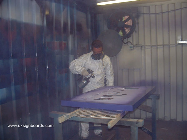 again it is split by a partition wall… one side has sink, compressor and shelving with a small hole in wall to feed air lines through for the guns.. the other is a clear area to spray signs and panels.