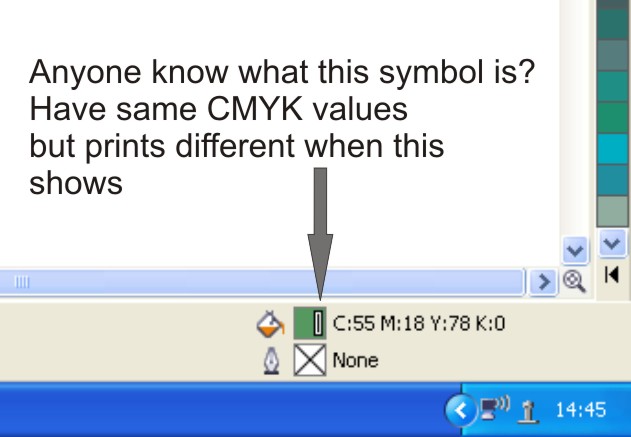 It means that colour is set to overfill. Any object under that colour will not knockout when separated. You can add overfill to fill – fill and outline – outline only. Right click on object and choose from selection.