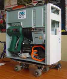 It came with a 500watt power supply. the case is all aluminum so its nice and light to carry around. I take it out to my garage once a month or so and blow it out with nitrogen from the Shock rebuilding station. I bought the case from electroseller.com.