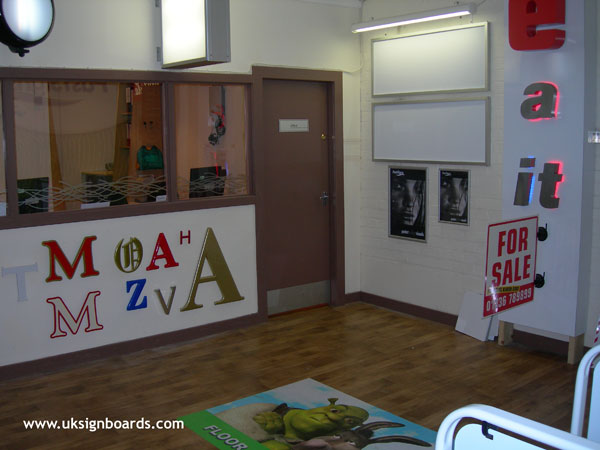 the reason for this was to allow me to screw some OLD fluorescent lights to the wall. 6 in total along the wall. i then printed onto back lit banner material and rigged the fluorescent lights to the lighting so when you turn the lights on in the work the wall illuminates also… its pretty effective and hides an old rough stone painted wall behind it…