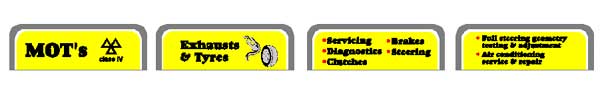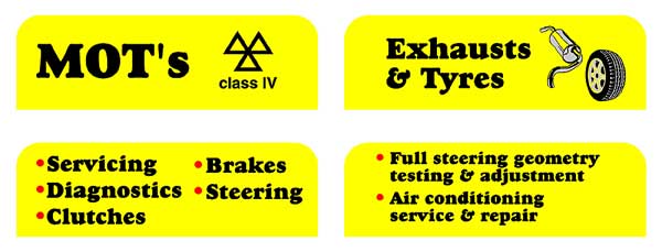 The signs are 1600mm x 500mm yellow faced ally. The garage owner has already had these made & sprayed so I’m afraid i’m stuck with the yellow.The other problem is the amount of text required on each sign, from one just saying ‘MOTs’ to the ridiculously long list of all their services, not sure about using the tyre & exhaust pictures.