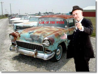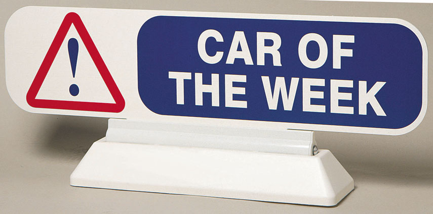 the sign sits on a swinging headboard advertising the car of the weekrich