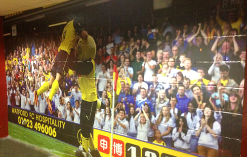 At the other end of the ground, bar areas were given the brick vinyl treatment, with the clubs crest applied to numerous walls, as well as floor to ceiling sized images of memorable Watford moments from history. Large graphics were also applied inside one of the hospitality areas, providing the area with an added sense of professionalism and identity.