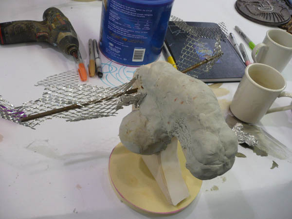 I cut the a rough profile shape of the moose head out of HDU and added aluminum foil to flesh it out adding Magic Sculpt Epoxy putty as an outer skin. The antlers started off with a skeleton of steel rod and lath with a skin of Magic Sculpt. Attached is a picture of the moose half finished.
