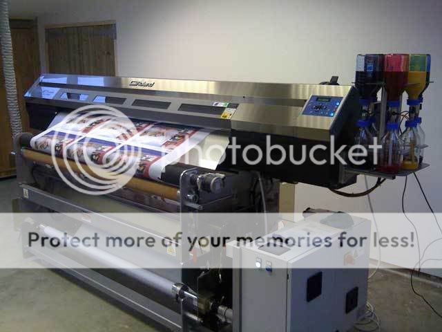 quote chrisbroad:The machine is a converted Roland XJ-740 bolted onto an ATP calender and control unit. This has enabled us to print directly to specially coated fabrics that sublimate when fed through the calender (heater).