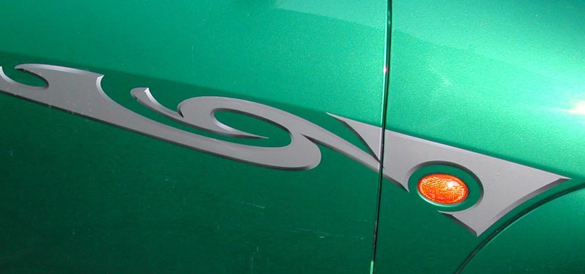 the design was drawn over a photo in signlab digitised cut in silver then before it was fitted i cut the same again as an inline )mask and sprayed just shadows and highlights removad the mask taped and appliedonce you have the design sorted the fancy bit only takes minutes
