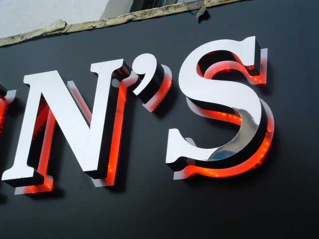 All lettering is mirror stainlesss steel. Main text halo illuminated with LED’s