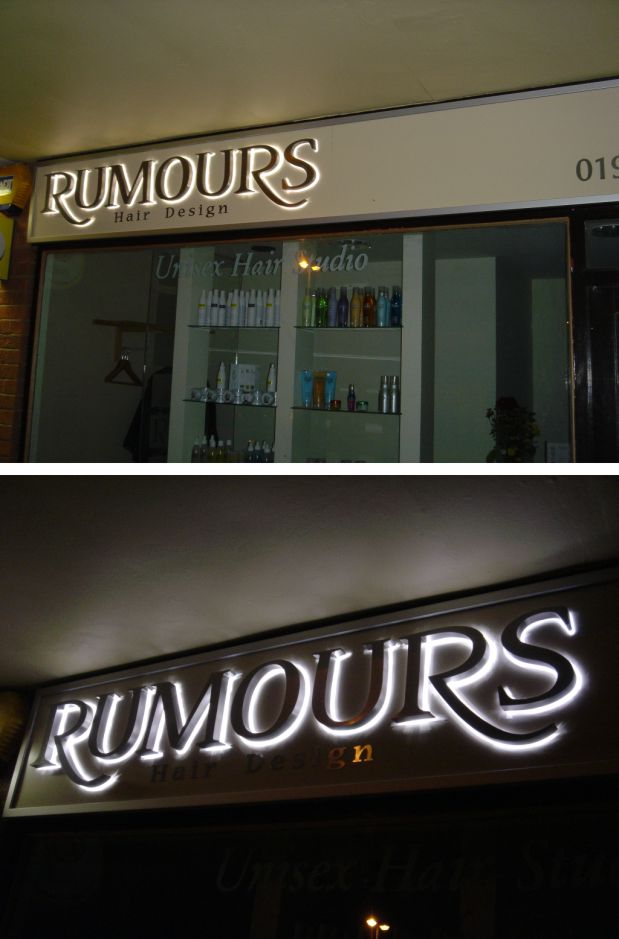 Posted by Nigel Fraser on 6 July 2004 at 21:34Just thought I’d show you guys/gals the result of my 1st ever LED illuminated sign. I don’t have a picture in the daytime yet but here are a couple of night shots. It’s (another!) hair dressers shop and the letters are built-up stainless with white leds mounted inside. Panel is cream dibond and fitted into a std eurotrim ali frame.