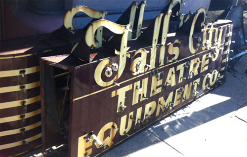 Call it a sign of the times: Workers removed the distinctive Falls City Theatre Equipment Co. neon sign from its longtime perch on Third Street on Thursday. For years, the sign hung on the building of the same name just south of Muhammad Ali Boulevard. But initial work has started preparing the old Water Company block for a planned Omni hotel and apartment project.
