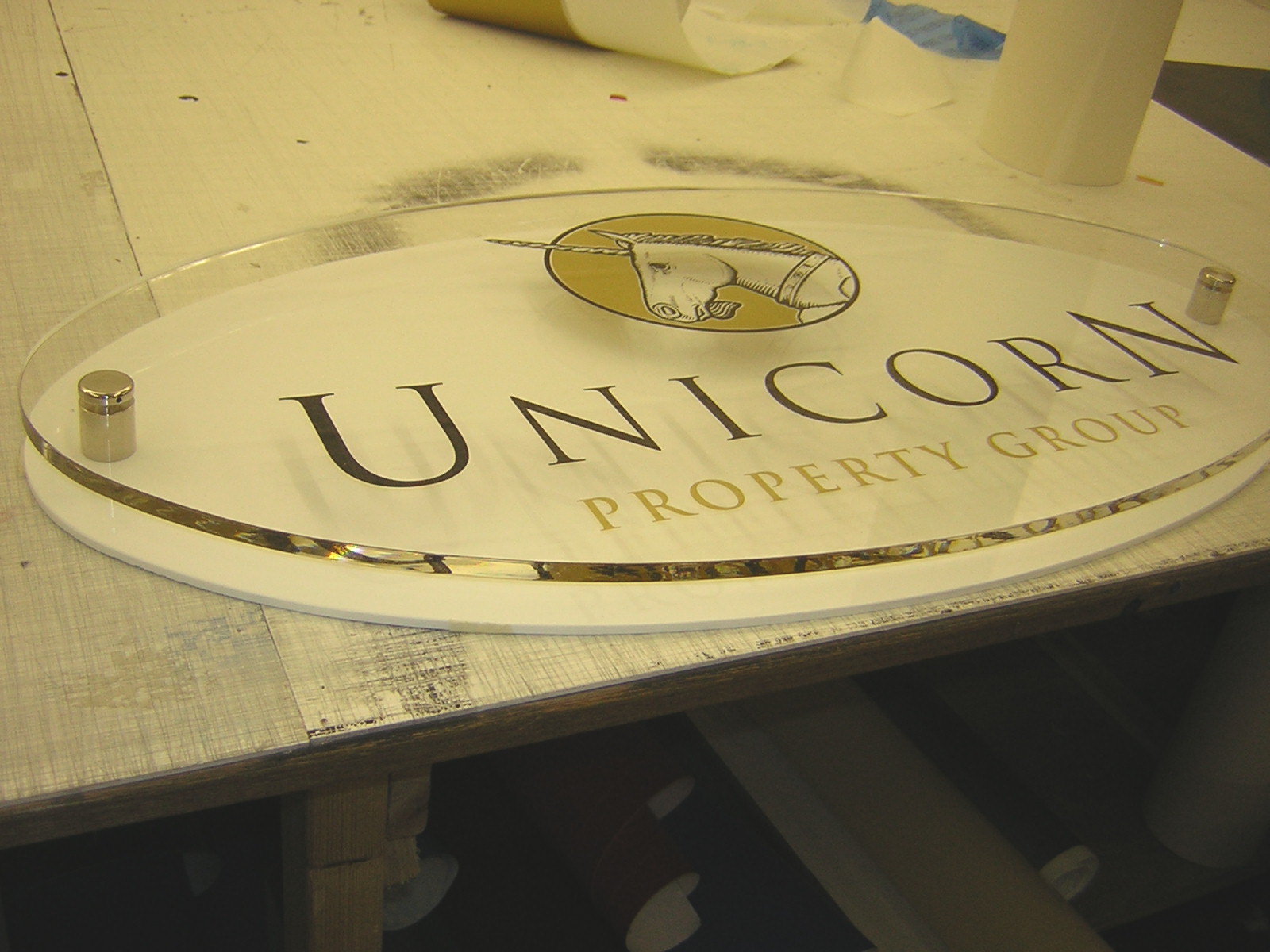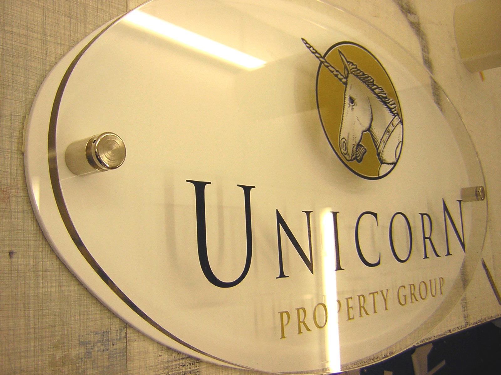 Unicorn oval – 800x400mm in 10mm acrylic with black & gold vinyl on rear. 6mm white acrylic as a back mount. Nickel plated 25mm stand-offs.
