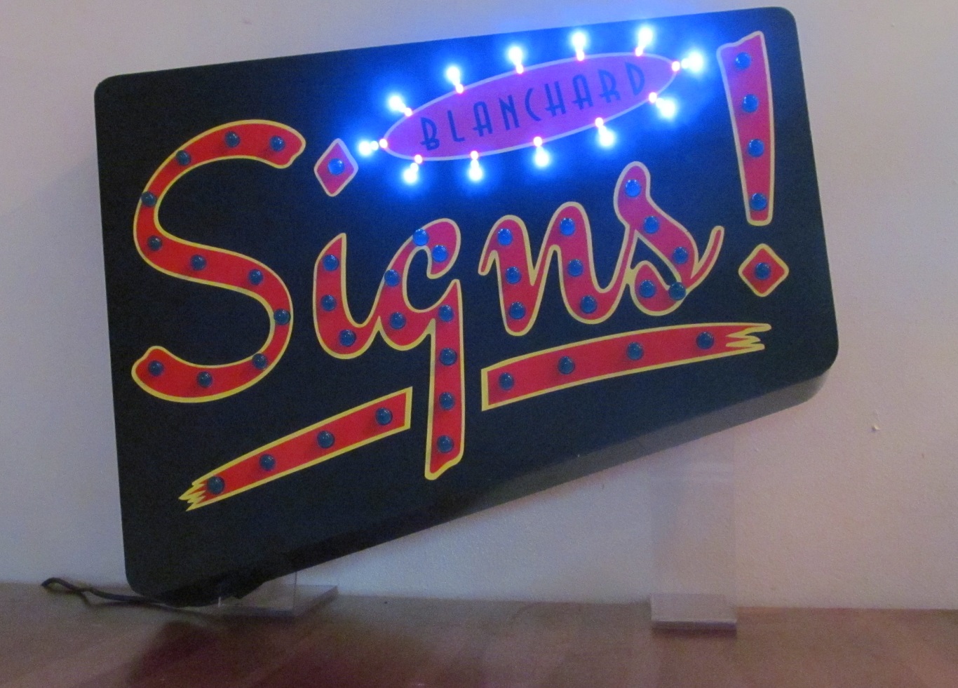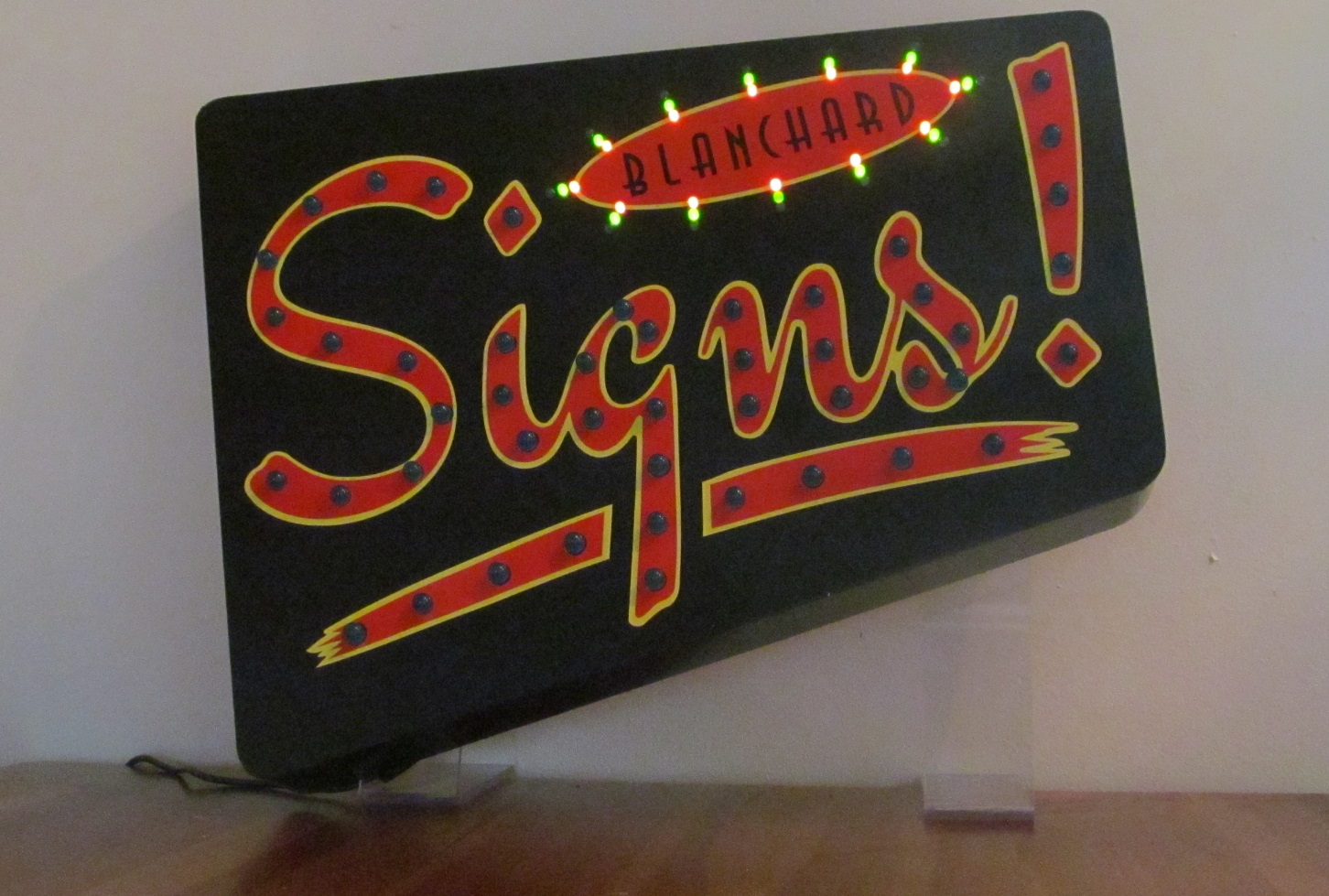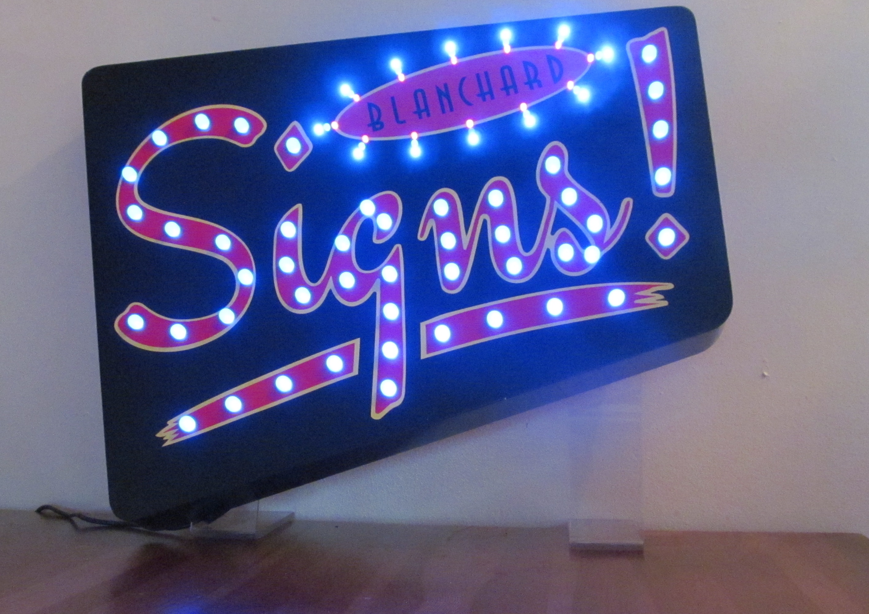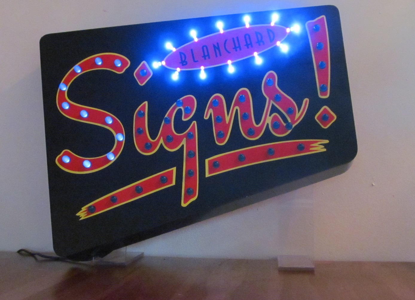 It starts with the 3 lines of leds around the perimeter of the word Blanchard. The orange leds light first then green then out to the blue, then the word signs lights 1 letter at a time. It all stays on for a moment then starts over again.