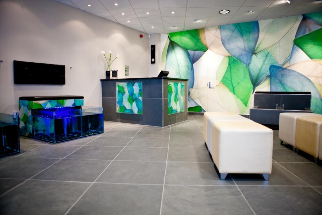 Glenn fascia was existing trim repainted black then new ACM panels using the matt side and print and laminated graphics to customer chosen pantone to tie in with the leaf design used internally.