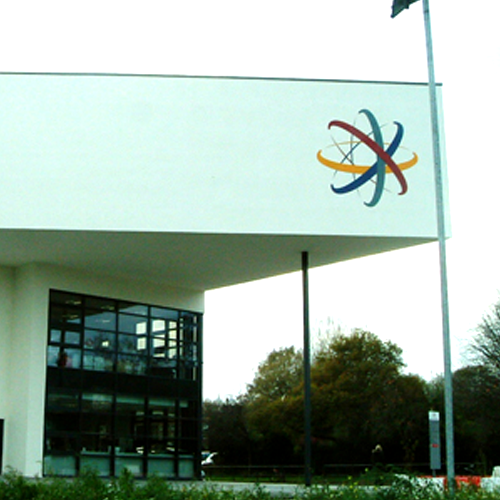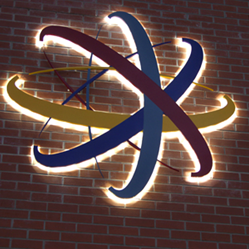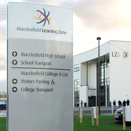 The Macclesfield College, LZ6 Sixth Form College, Macclesfield High School and the Sports Centre buildings are identified using individual letters. Built-up stainless steel letters are used for the College and High School, with the College sign mounted to a fabricated framework suspended within the entrance rotunda, and the High School letters being illuminated using a slimline trough light fixture. A large, intricately fabricated built-up logo at the high school has also been installed, and is illuminated by low-voltage LEDs to provide a halo illumination effect. The LZ6 letters and large 3.5m logo are fret-cut and painted, with the finished sign giving the appearance that it is an integral part of the building façade.