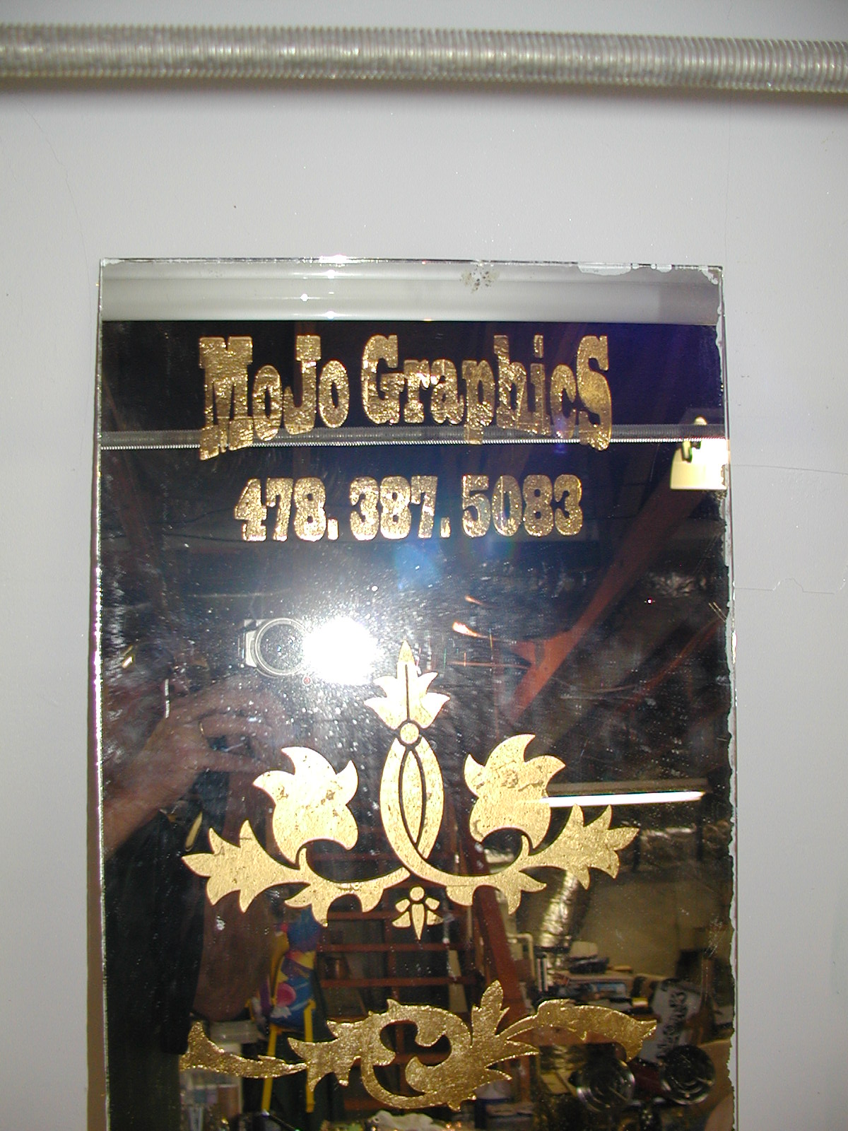 Hey guys, and Jill. I thought maybe I ought to explain myself better as to what I’m doin’. I am actually gilding the design on the back side of some mirrors, where when you look at/into the mirror, you see the design inside of the mirror. That is why I was looking at the water gilding to maybe get a little clearer looking gild, when seeing it through the front. Although, my initial attempts have been pretty clear with the oil size, the major difference has been the leaf itself. I have used some imitation leaf, some Swift 23.5++, and some Thai leaf from e-bay. You probably don’t want to know which is the better looking. Here’s a pretty bad picture, I’l get some better ones, didn’t know mirrors were so hard to photo. Thanks Mike