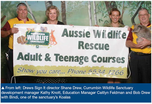 Many in the signage industry who have got to know Shane Drew over the years have described him as a “one-off”. He seems to revel in the challenges life puts in front of him. One of these challenges is his ongoing support of the world famous Currumbin Wildlife Sanctuary, home to the world’s largest collection of Australian native animals. In the short time Drews Sign It has been sponsoring the sanctuary, the company has donated signage worth nearly $5000 to the sanctuary. The question is, why he does it, and what’s in it for his business. ‘I didn’t go into this situation thinking ‘how can I make this work for me’, he explained. ‘My father and I were invited to a corporate day, because we’d donated signage to the shuttle bus contractor who was also trying to raise donations for the sanctuary.’ Shane’s approach was honestly based on what we could do for them.