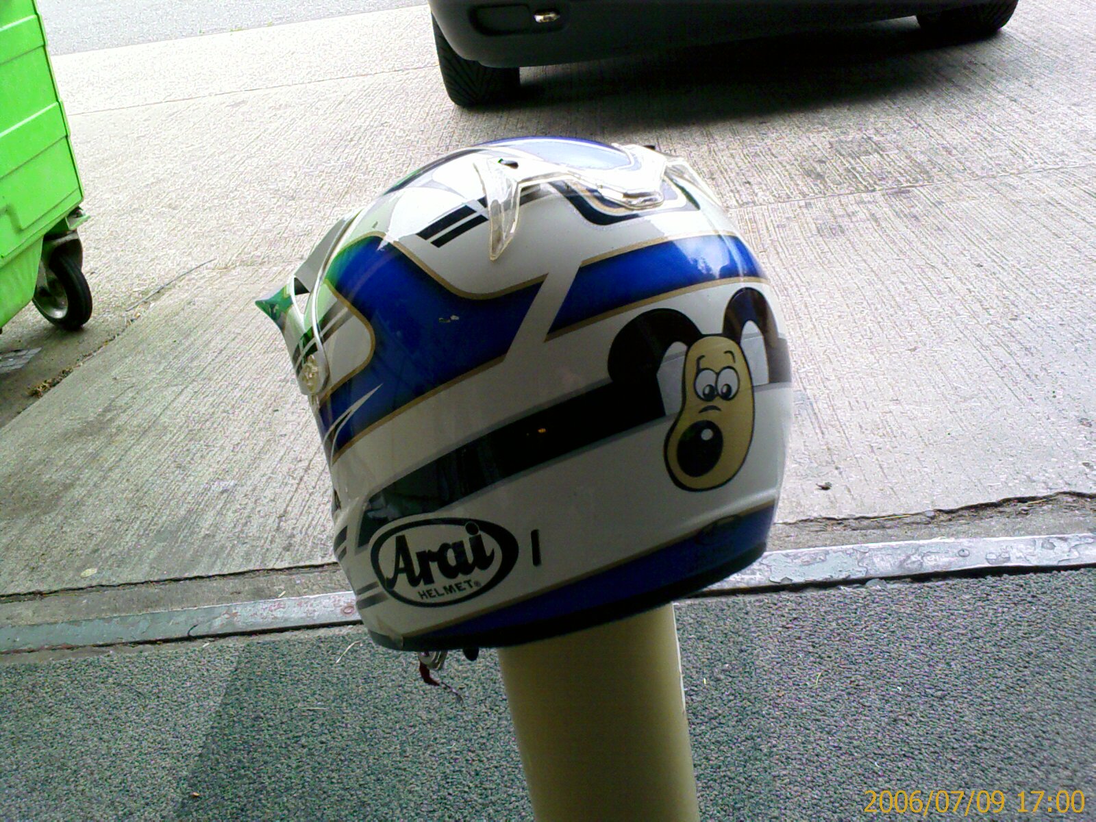 My mate is known as Gromit when he races his bike, probably because all he seems to eat is cheese sandwiches. This is just cut vinyl stuck onto the back of his grasstrack helmet to amuse the children at the race meetings. He’s just gone out to compete in Holland where he’s better known as Gromit.