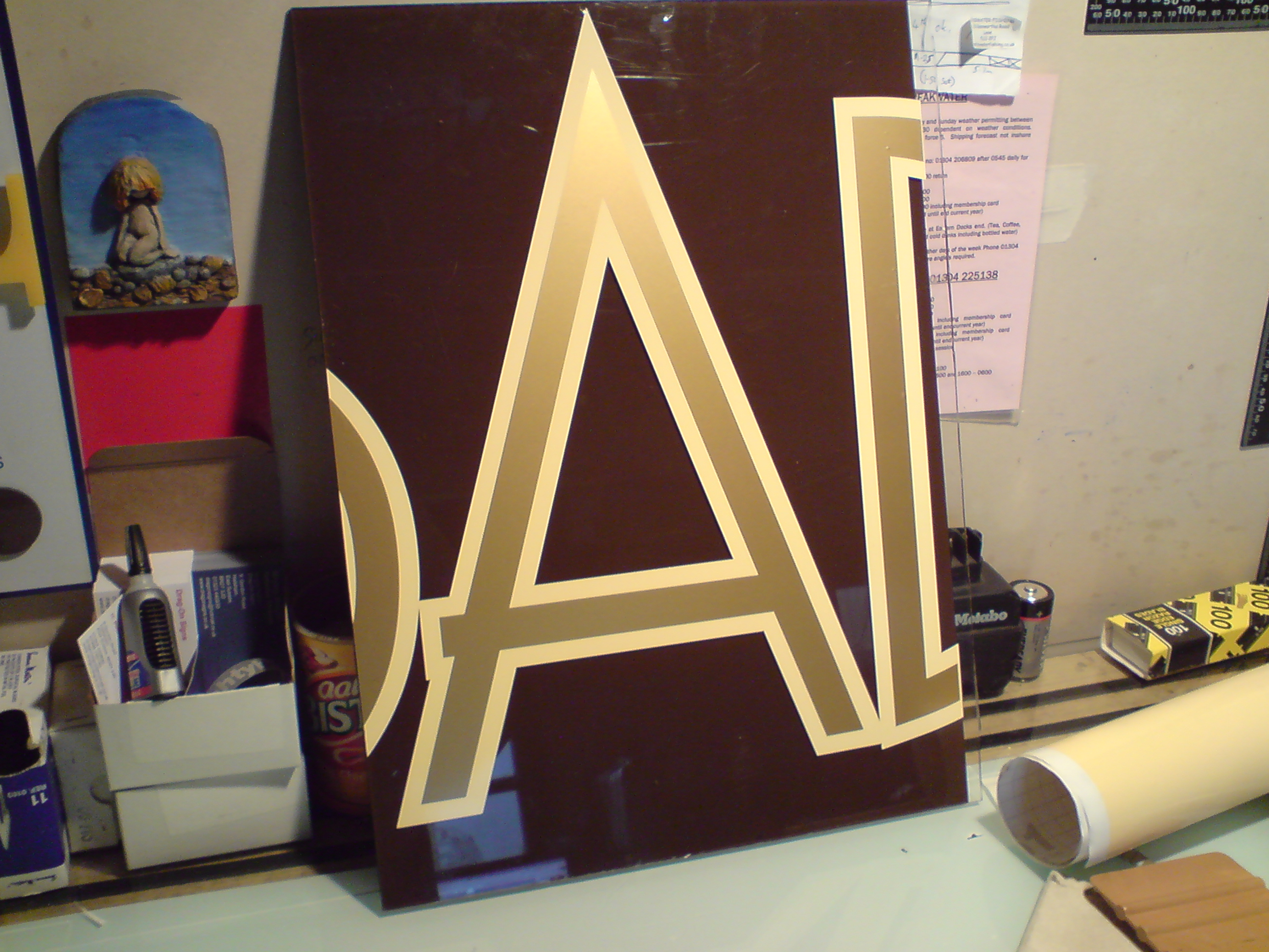 i had planned on doing the panels in clear 5mm acrylic to allow the cream to show through, with the black behind to block out the light to everywhere except the area behind the lettering. the lettering it white first, with a brown tex / gold border covering the white.
