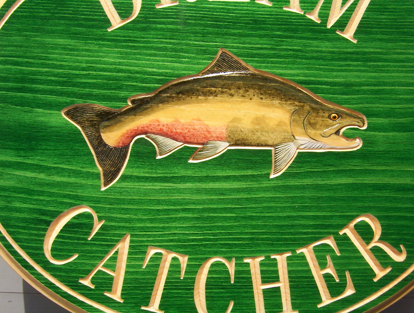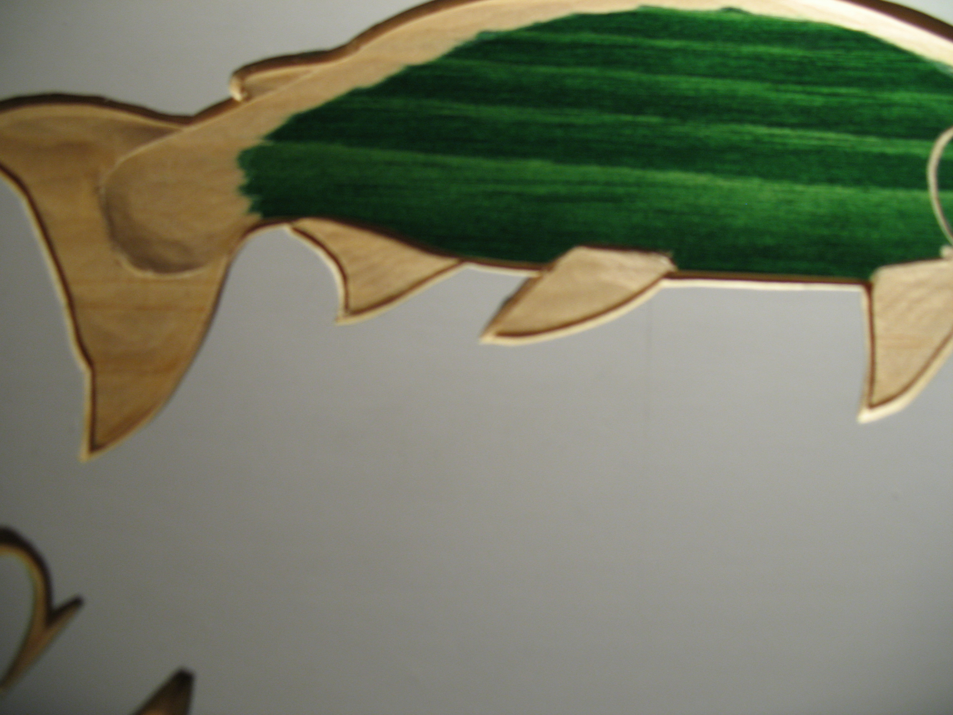 Posted by Joe Cieslowski on 17 February 2007 at 14:51This is carved the same way as the Elf on the slab. "V" cut around the edge and then the salmon is carved to shape and sanded, then stained. Overall size is 14"x17". White pine.