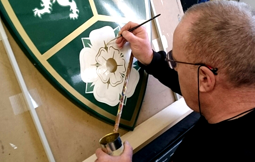 Company sales manager Gareth Ottsaid: "We’ve had a close working relationship with South Craven School for several years and we carry out a variety of jobs for them. "Recent work we’ve done for South Craven includes a large montage that has gone up inside the school. "The traditional signs for this job were made using aluminium trays. They were firstly painted in green, then all the lettering and school badges were hand painted on by our production manager Chris Ellis.