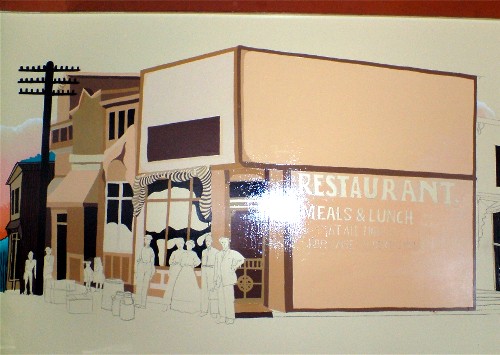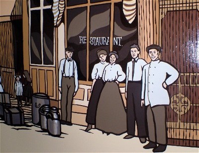 The heads on the 1907 people have been replaced with those of modern-day friends and family of the restaurant owner.