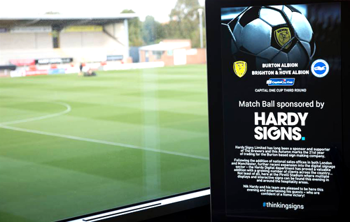 Burton-based Hardy Signs is one of the industry’s leading sign makers. With offices in Central London and Manchester they serve regional and premier league football clubs including Burton Albion, Derby FC, Notts County and Liverpool FC, with signage, multi-format graphics and dynamic digital displays. Hardy Digital is a dedicated department of Hardy Signs, which is launching a new range of touch screen digital display solutions.
