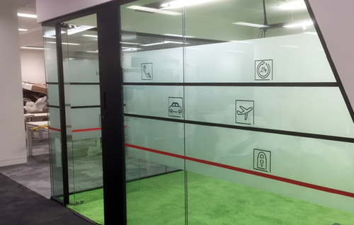 The office block contains a vast number of meeting rooms, each room is named and has its own theme. This is reflected in the larger meeting rooms by having wall tex applied to the feature wall depicting the theme. Each wall is bespoke, with some of them having a 3D effect which Hawes Signs achieved by cutting out images of London landmarks in varying thickness of cardboard. Vinyl designs were added to all meeting room windows in a red and black manifestation with little icons representing various Post Office activities. The orientation of red line tells you which floor you are on.