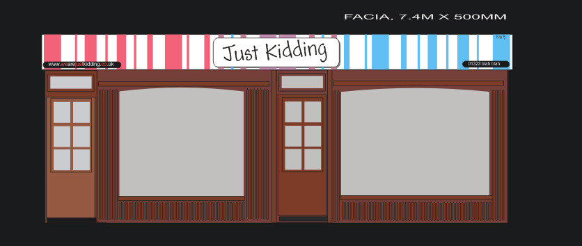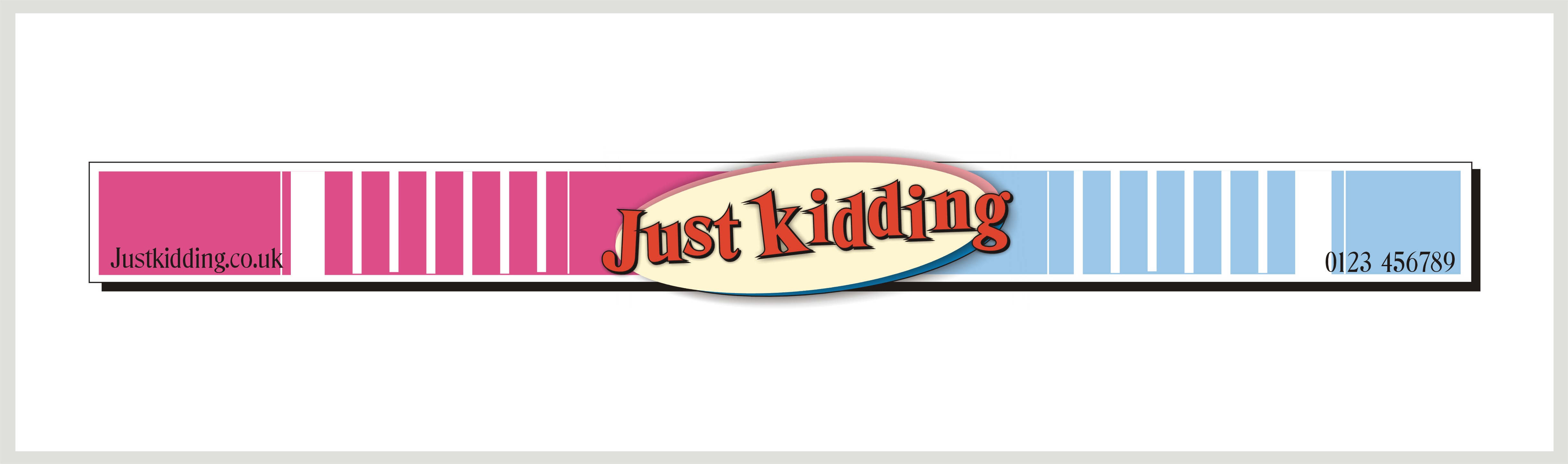 the name ‘just kidding’ needs to be in a child-like font, but legible, the font they showed me was hard to read, so for now, i’ve substituted it for ‘andy’. single colour on white seems easiest at mo, purely to keep it from being too busy or clashing with the rear panels,
